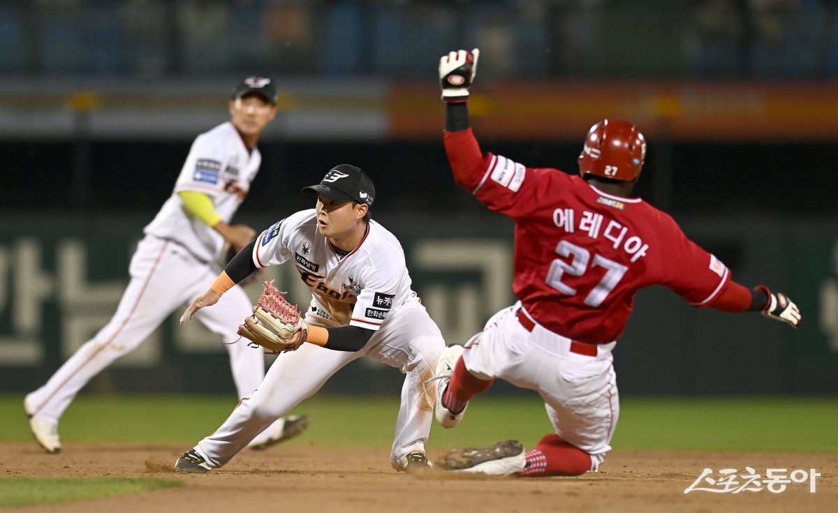 2일 대전 한화생명이글스파크에서 ‘2024 신한은행 SOL뱅크 KBO리그’ SSG 랜더스와 한화 이글스 경기가 열렸다. 4회초 1사 1루 상황에서 SSG 1루주자 에레디아가 2루 도루에 성공하고 있다.