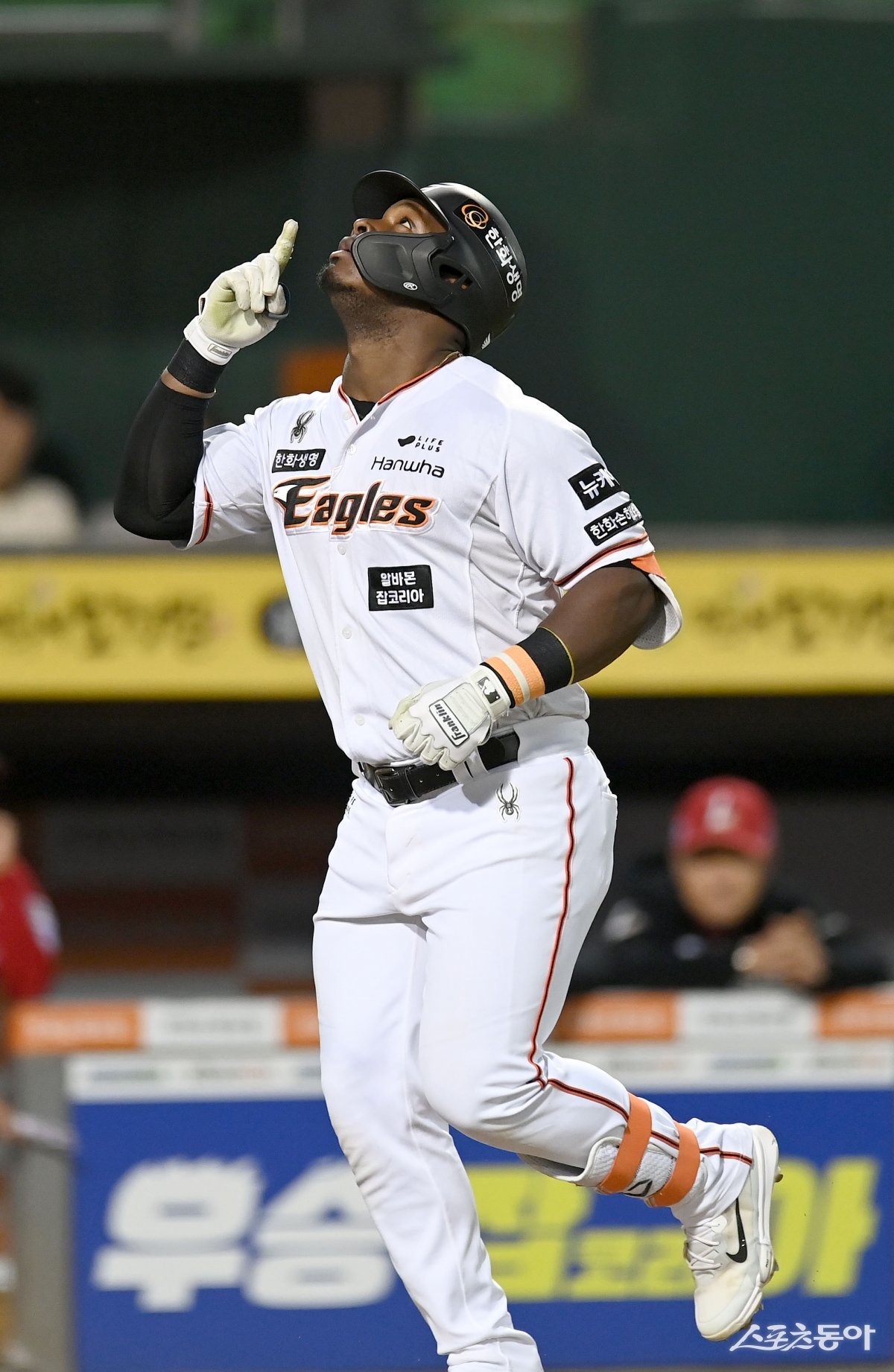 2일 대전 한화생명이글스파크에서 ‘2024 신한은행 SOL뱅크 KBO리그’ SSG 랜더스와 한화 이글스 경기가 열렸다. 3회말 2사 3루 한화 페라자가 역전 좌월 투런 홈런을 날리고 그라운드를 돌아 홈인하고 있다.