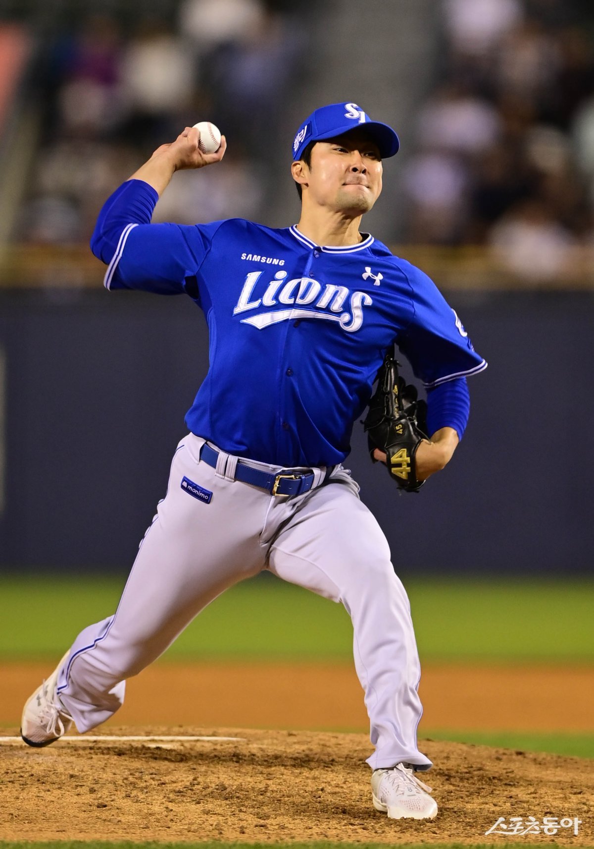 2일 서울 잠실야구장에서 열린 ‘2024 신한 SOL 뱅크 KBO리그’ 두산 베어스와 삼성 라이온즈의 경기에서 7회말 삼성 임창민이 교체로 마운드에 올라 역투하고 있다.