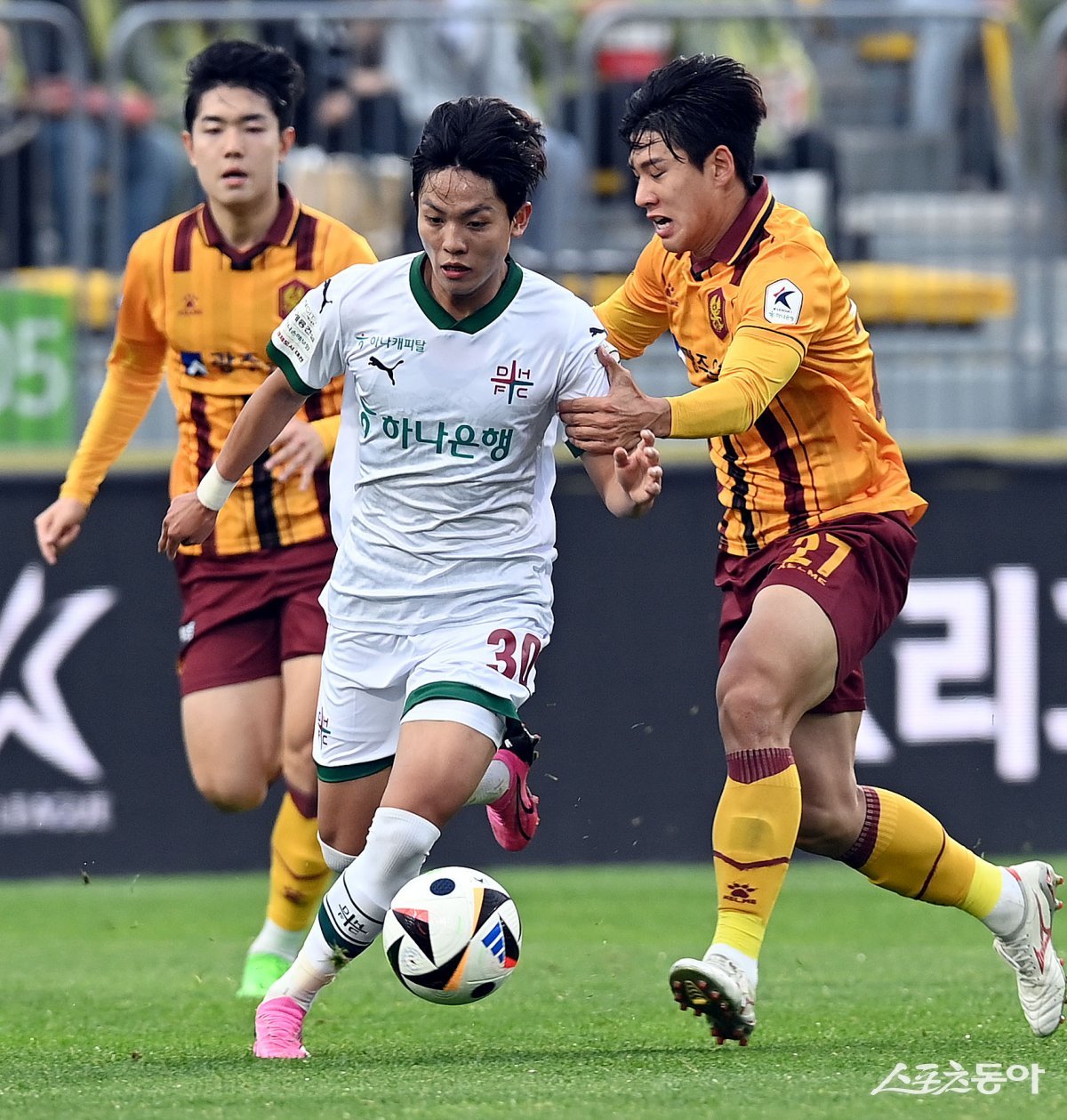 6일 광주 축구전용경기장에서 열린 ‘하나은행 K리그1 2024’ 광주 FC와 대전 하나시티즌의 경기에서 대전 배서준이 광주 수비를 피해 돌파를 시도하고 있다.