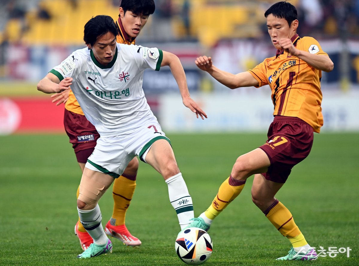 6일 광주 축구전용경기장에서 열린 ‘하나은행 K리그1 2024’ 광주 FC와 대전 하나시티즌의 경기에서 대전 공민현과 광주 김한길이 볼 다툼을 벌이고 있다.