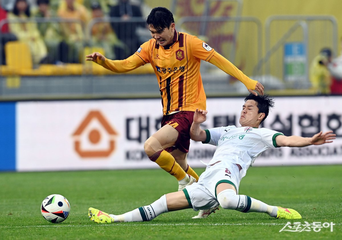 6일 광주 축구전용경기장에서 열린 ‘하나은행 K리그1 2024’ 광주 FC와 대전 하나시티즌의 경기에서 광주 정호연이 대전 주세종의 태클을 피해 돌파하고 있다.