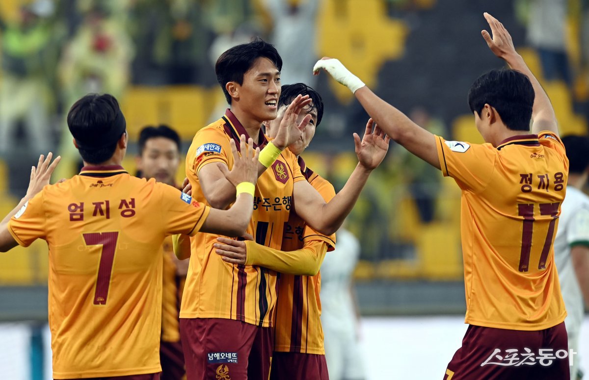 광주가 6일 광주축구전용구장에서 열린 ‘하나은행 K리그1 2024’ 11라운드 홈경기에서 대전하나시티즌에 2-1 역전승을 거뒀다. 2연승을 거둔 광주는 8위(4승6패·승점 12)로 올라섰다.