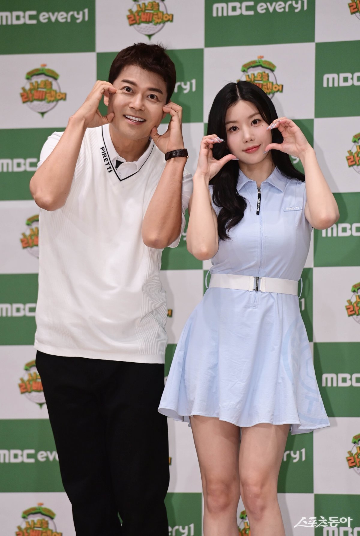 방송인 전현무, 가수 권은비가 7일 서울 중구 장충동 앰배서더 서울 풀만에서 열린 MBC 에브리원 ‘나 오늘 라베했어’ 제작발표회에서 포즈를 취하고 있다.