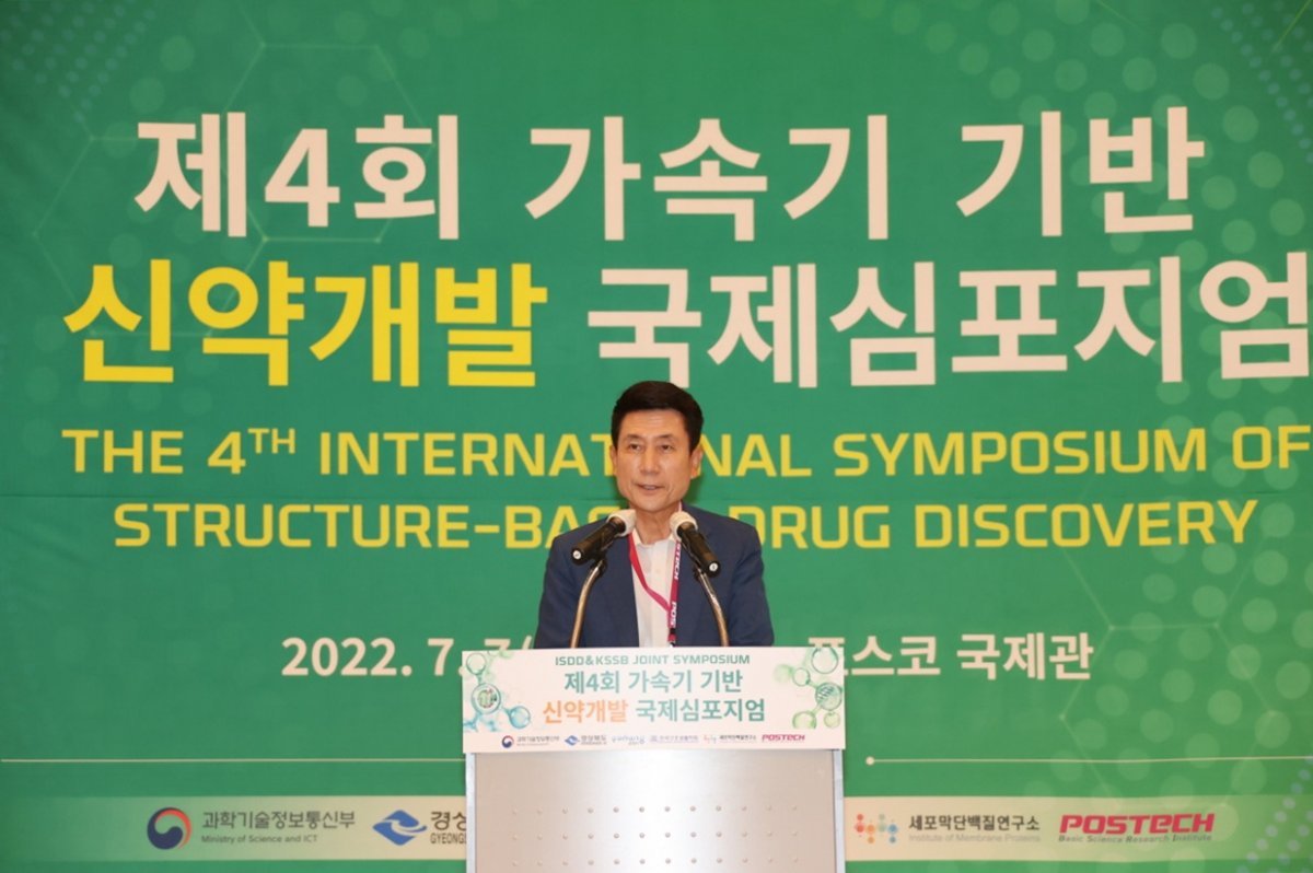 이강덕 포항시장이 지난 2022년 개최된 ‘제4회 가속기 기반 신약 개발 국제심포지엄’에 참석해 발언하고 있다.