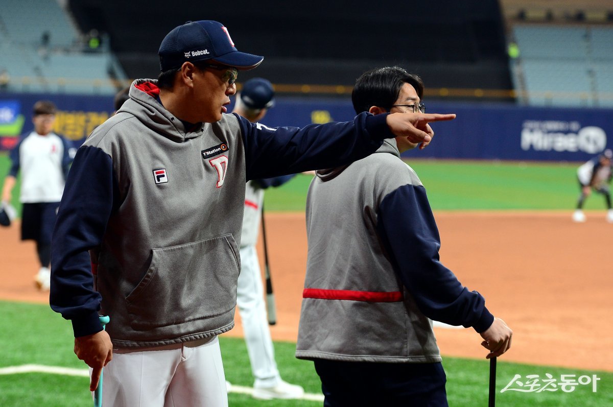 7일 서울 고척스카이돔에서 ‘2024 신한 SOL 뱅크 KBO리그’ 키움 히어로즈와 두산 베어스의 경기가 열린다. 경기 전 두산 이승엽 감독이 선수들의 훈련을 체크하고 있다.