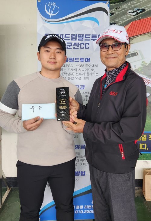 4차 대회 우승자 문준혁(왼쪽)에게 드림필드투어 오종만 경기위원장이 트로피와 상금을 전달하고 있다. 사진제공 | 리앤브라더스