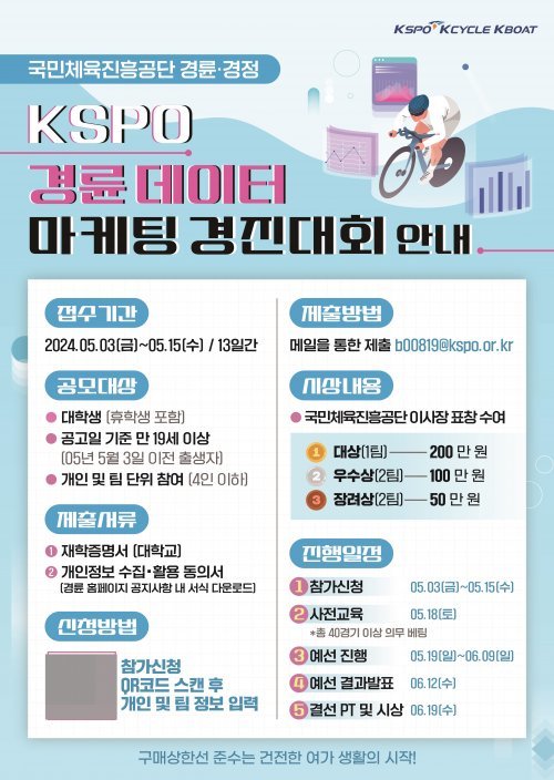 서울올림픽기념국민체육진흥공단(이사장 조현재) 경륜경정총괄본부는 15일까지 ‘2024 경륜 데이터 마케팅 경진대회’ 참가 접수를 받는다. 이번 경진대회는 경륜 경정 온라인 베팅 사이트 ‘스피드온’ 체험을 토대로 2030 대상의 데이터 마케팅 아이디어를 발굴하기 위해 마련했다. 만 19세 이상의 대학생은 누구나 개인 또는 4인 이하 단체로 참여할 수 있다. 대회는 18일 사전교육, 19일부터 6월 9일까지 예선, 6월 19일에는 결선과 시상식 순으로 진행한다. 총상금 500만 원으로 대상 200만 원(1팀), 우수상 100만 원(2팀), 장려상 50만 원(2팀)이다. 모의 체험으로 결선 진출자를 가렸던 지난해와는 달리 올해는 참가자들이 ‘스피드온’을 직접 체험하고 현실적인 데이터 마케팅 아이디어를 내도록 바뀌었다. 경륜경정총괄본부 관계자는 “대학생들이 데이터 분석능력, 마케팅 역량을 키울 기회로 효과적인 2030 대상 경륜 데이터 마케팅 아이디어를 얻기를 기대하고 있다”고 밝혔다.
