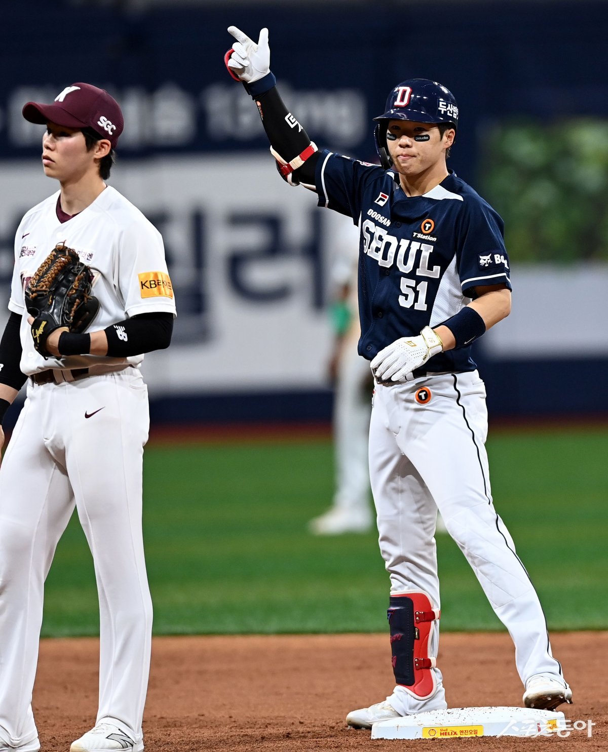 7일 서울 고척스카이돔에서 ‘2024 신한 SOL 뱅크 KBO리그’ 키움 히어로즈와 두산 베어스의 경기가 열렸다. 2회초 2사 1, 2루에서 두산 조수행이 1타점 적시타를 날린 후 2루까지 진루해 세리머니를 펼치고 있다.