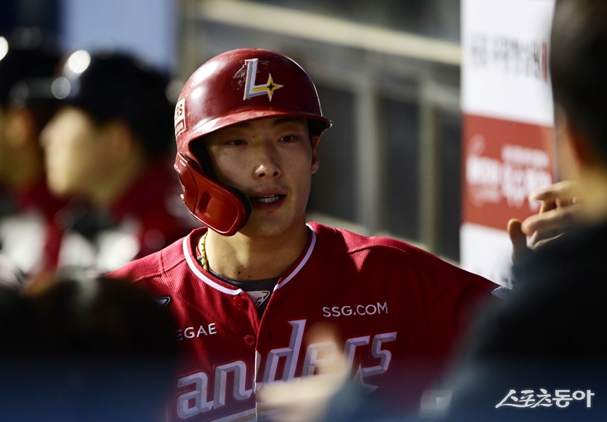 7일 서울 잠실야구장에서 열린 ‘2024 신한 SOL 뱅크 KBO리그’ LG 트윈스와 SSG 랜더스의 경기에서 4회초 1사 2, 3루 SSG의 희생타로 득점에 성공한 3루주자 최지훈이 더그아웃에서 동료들의 축하를 받고 있다.