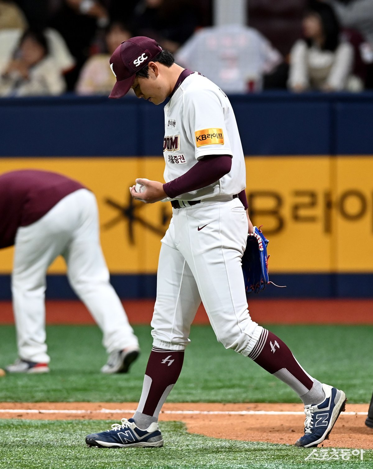 7일 서울 고척스카이돔에서 ‘2024 신한 SOL 뱅크 KBO리그’ 키움 히어로즈와 두산 베어스의 경기가 열렸다. 5회까지 8실점을 허용한 키움 선발 이종민이 아쉬워하고 있다.