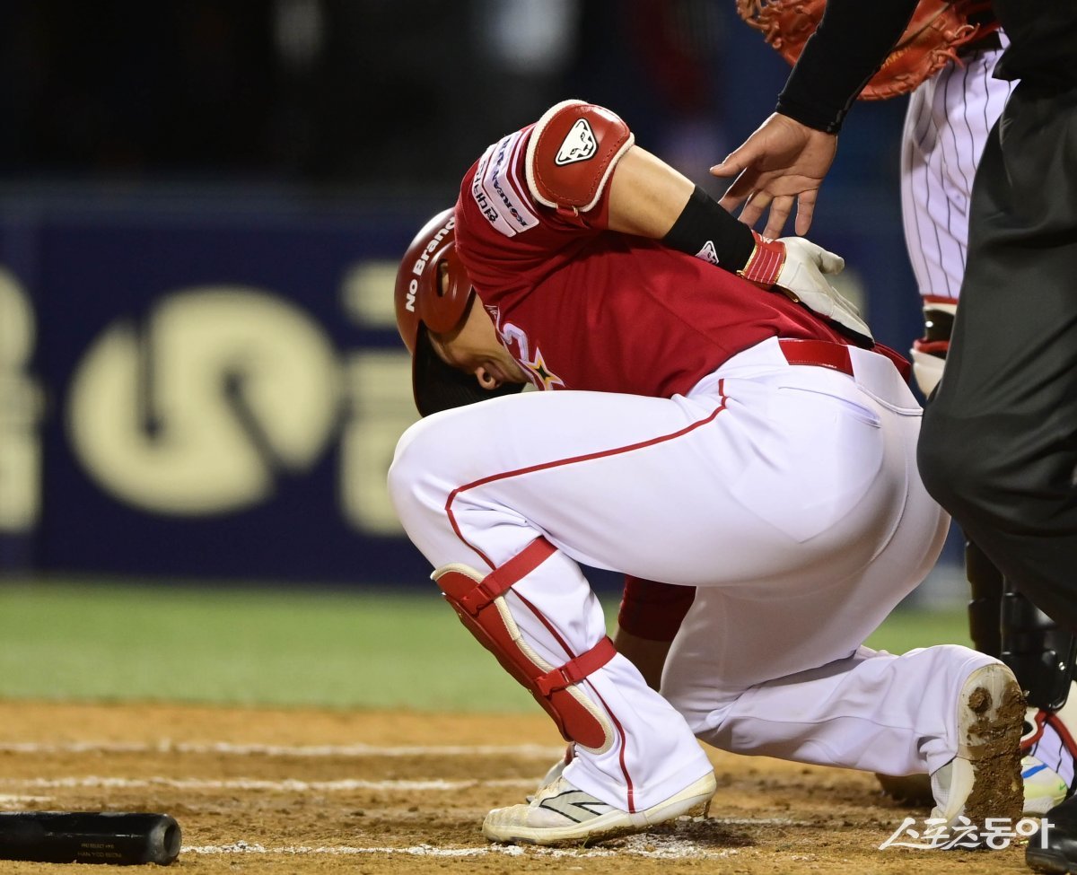 7일 서울 잠실야구장에서 열린 ‘2024 신한 SOL 뱅크 KBO리그’ LG 트윈스와 SSG 랜더스의 경기에서 7회초 1사 1루 SSG 이지영이 투구된 볼에 맞은 후 고통을 호소하고 있다.
