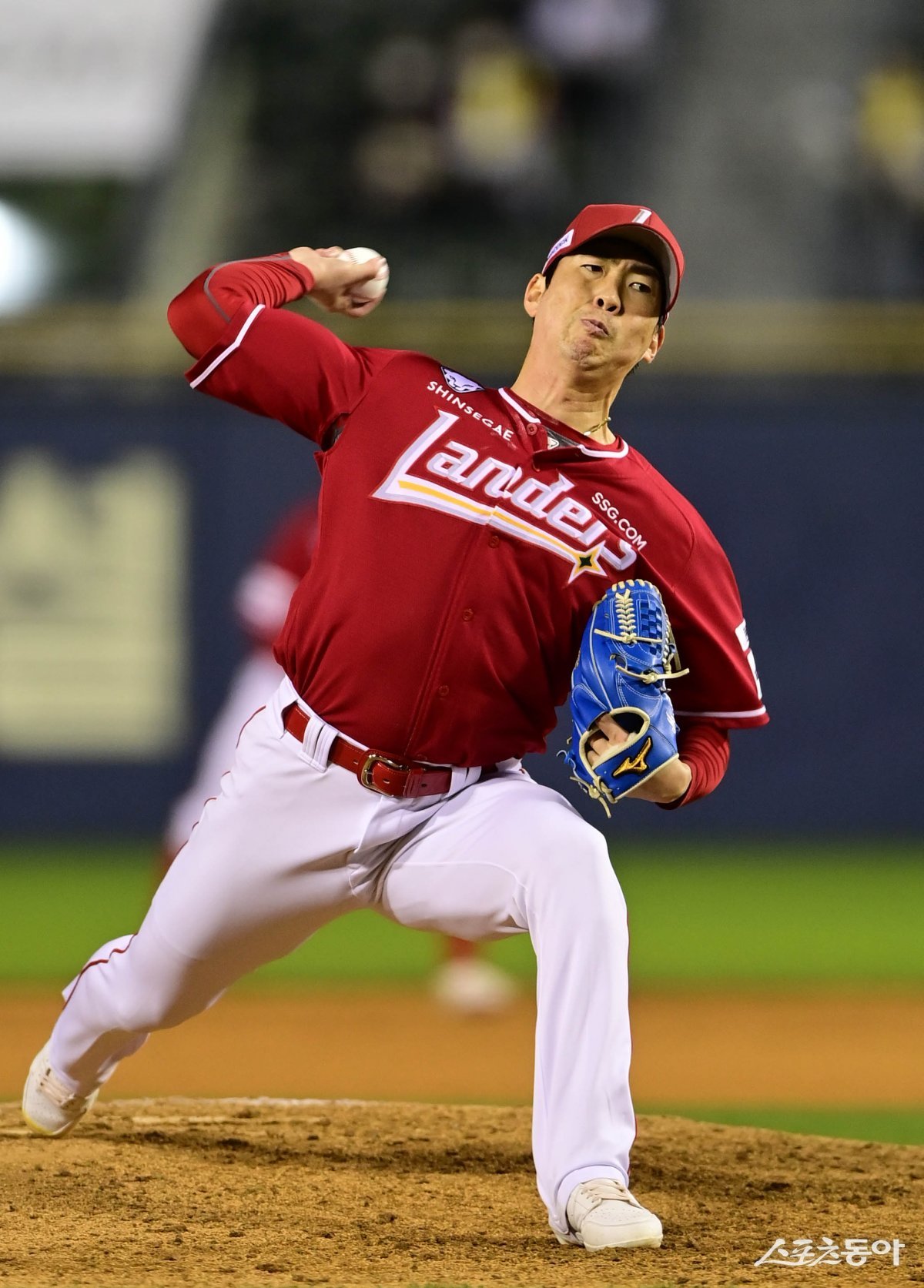 7일 서울 잠실야구장에서 열린 ‘2024 신한 SOL 뱅크 KBO리그’ LG 트윈스와 SSG 랜더스의 경기에서 9회말 SSG 문승원이 교체로 마운드에 올라 역투하고 있다.