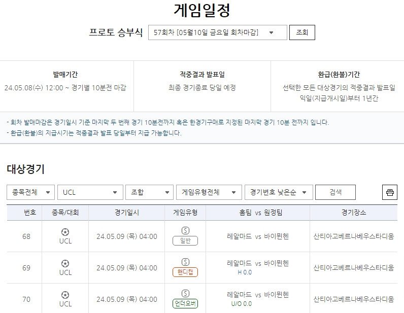 프로토 승부식 57회차, 2023~2024시즌 UEFA 챔피언스리그 4강 2차전 레알 마드리드-바이에른 뮌헨전 대상경기 선정