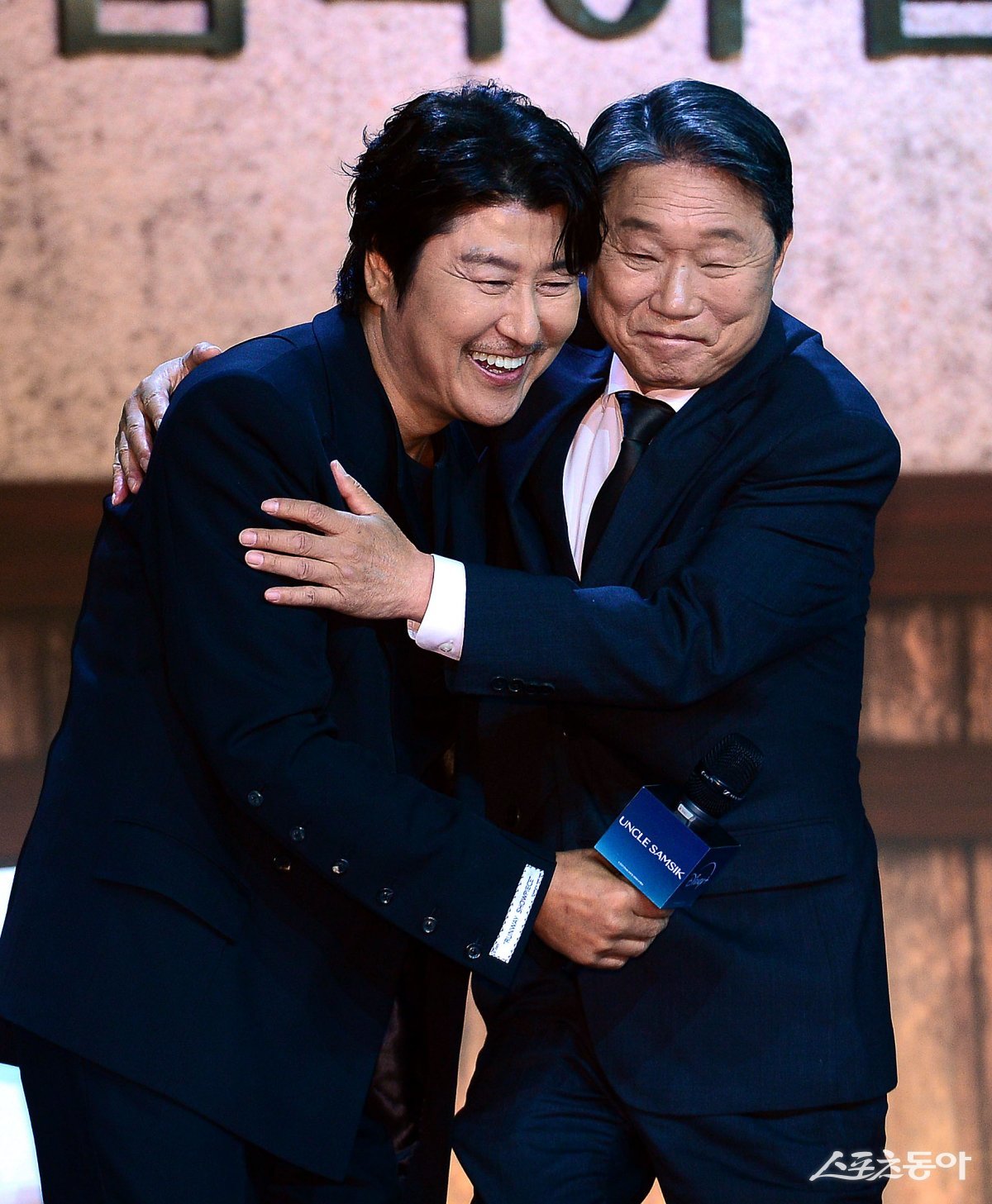 8일 서울 강남구 삼성동 그랜드 인터컨티넨탈 서울 파르나스 그랜드볼룸에서 열린 디즈니+ 오리지널 시리즈 ‘삼식이 삼촌’ 제작발표회에 참석한 송강호와 주진모가 인터뷰도중 포옹을 나누고 있다.