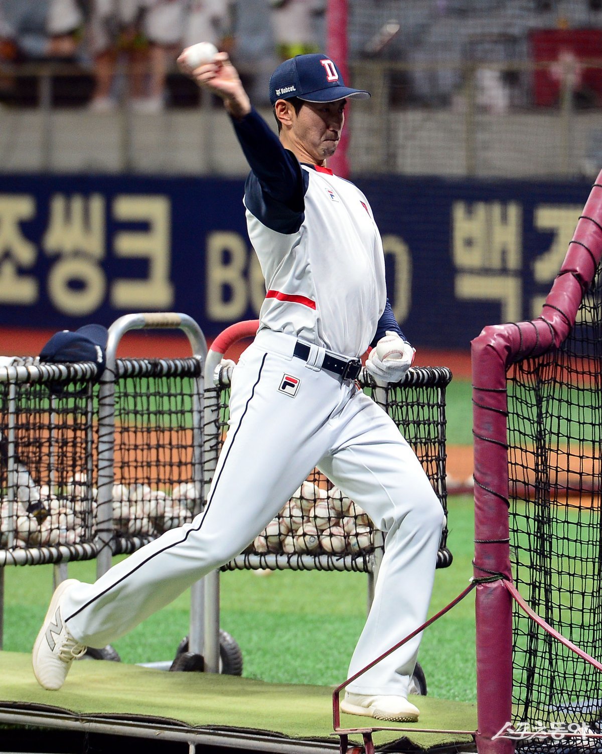 8일 서울 고척스카이돔에서 ‘2024 신한 SOL 뱅크 KBO리그’ 키움 히어로즈와 두산 베어스의 경기가 열린다. 경기 전 두산 정진호 코치가 배팅볼을 던지고 있다.