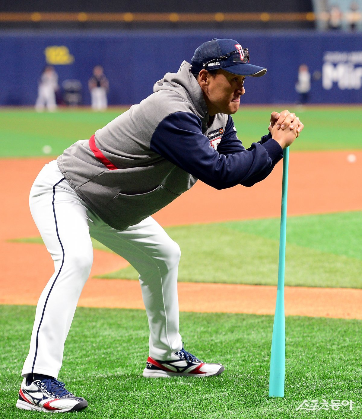 8일 서울 고척스카이돔에서 ‘2024 신한 SOL 뱅크 KBO리그’ 키움 히어로즈와 두산 베어스의 경기가 열린다. 경기 전 두산 이승엽 감독이 선수들의 훈련을 지켜보고 있다.