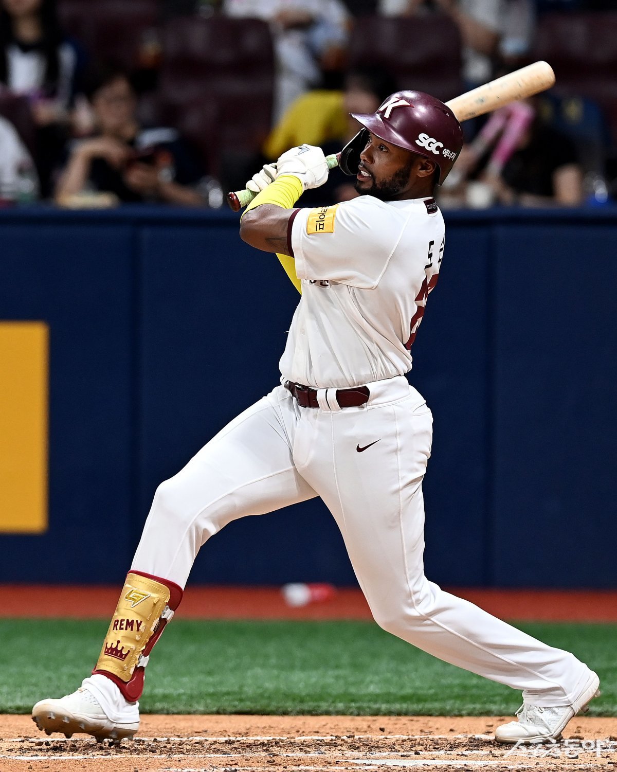 8일 서울 고척스카이돔에서 ‘2024 신한 SOL 뱅크 KBO리그’ 키움 히어로즈와 두산 베어스의 경기가 열렸다. 3회말 1사 2루에서 키움 도슨이 1타점 동점 적시타를 날리고 있다.