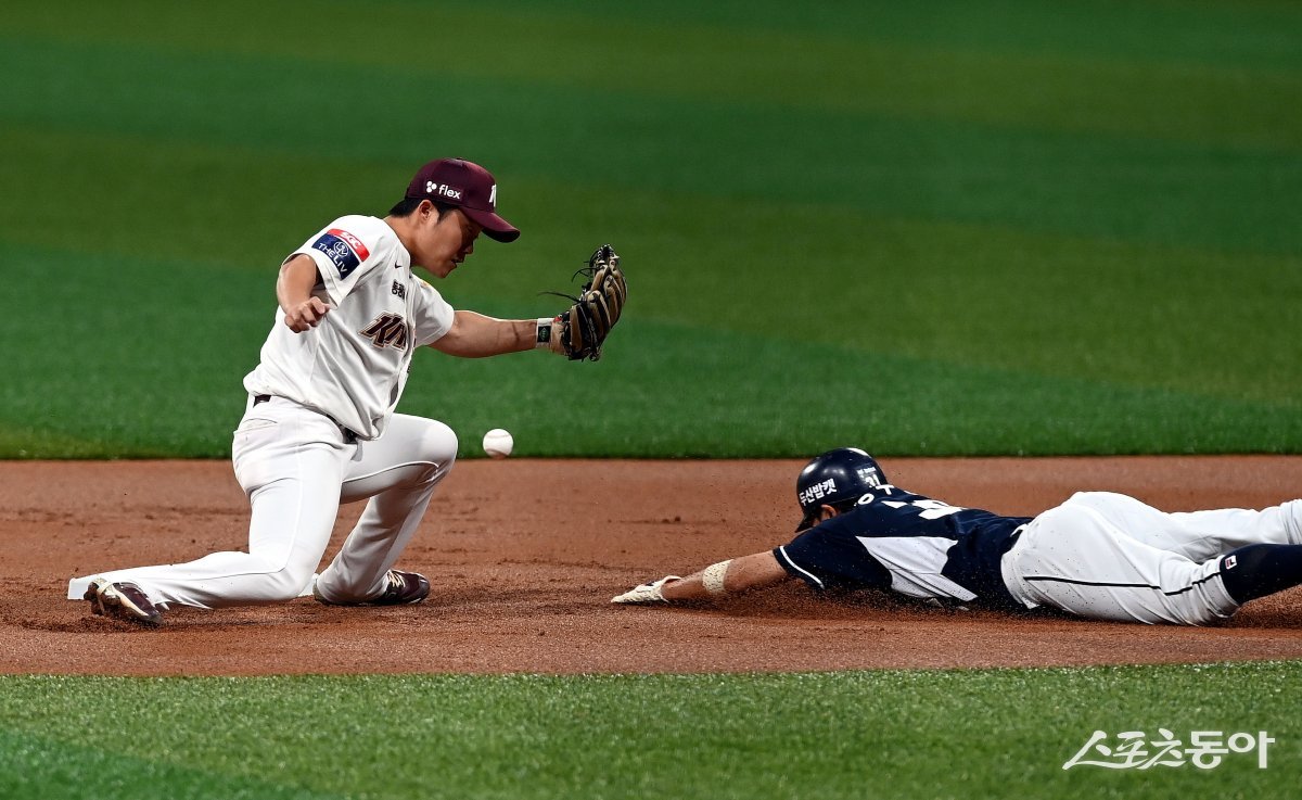 8일 서울 고척스카이돔에서 ‘2024 신한 SOL 뱅크 KBO리그’ 키움 히어로즈와 두산 베어스의 경기가 열렸다. 1회초 1사 1루에서 두산 정수빈이 2루 도루를 성공시키고 있다.