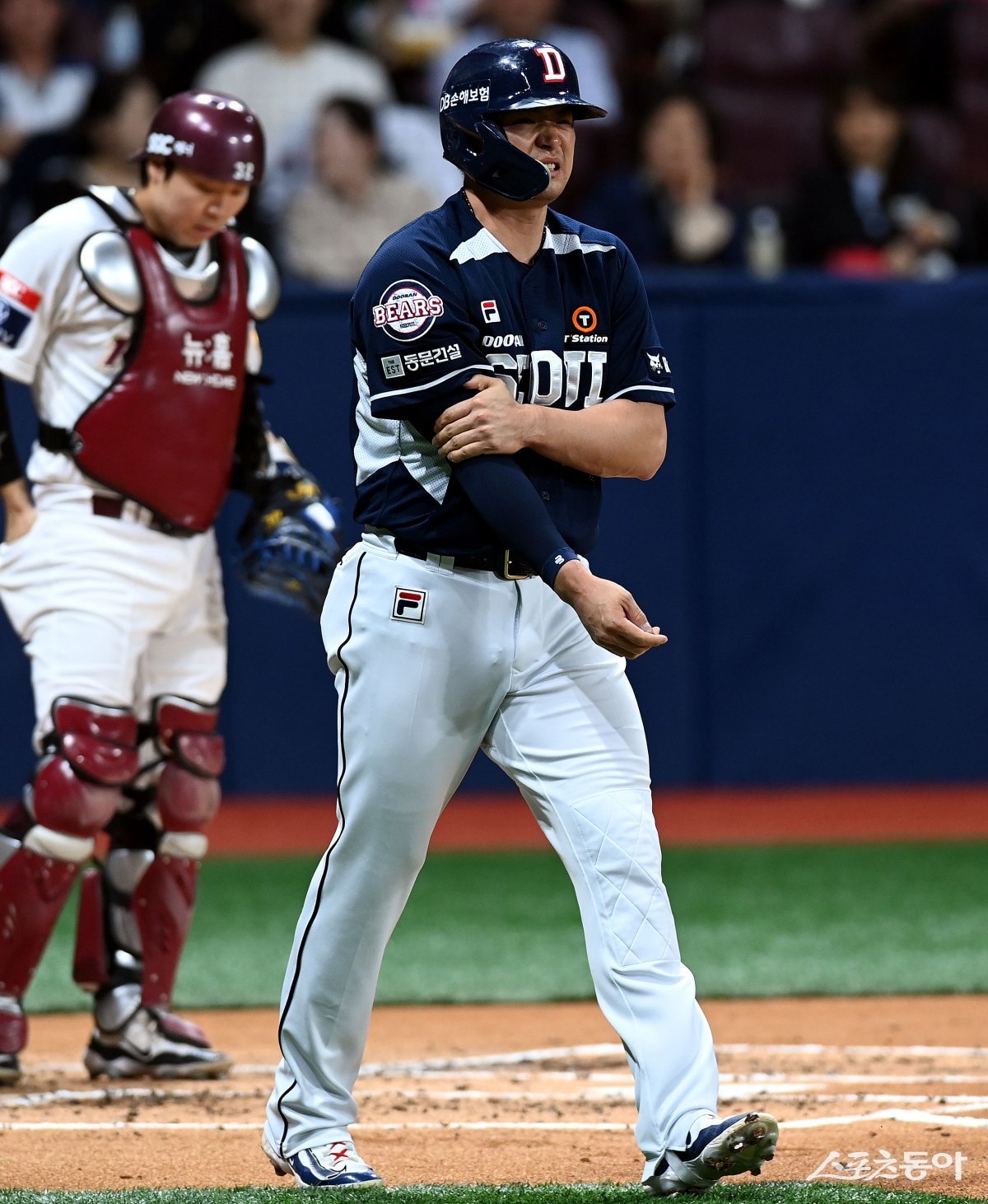 8일 서울 고척스카이돔에서 ‘2024 신한 SOL 뱅크 KBO리그’ 키움 히어로즈와 두산 베어스의 경기가 열렸다. 2회초 1사에서 두산 김재환이 몸에 맞는 볼로 출루하고 있다.