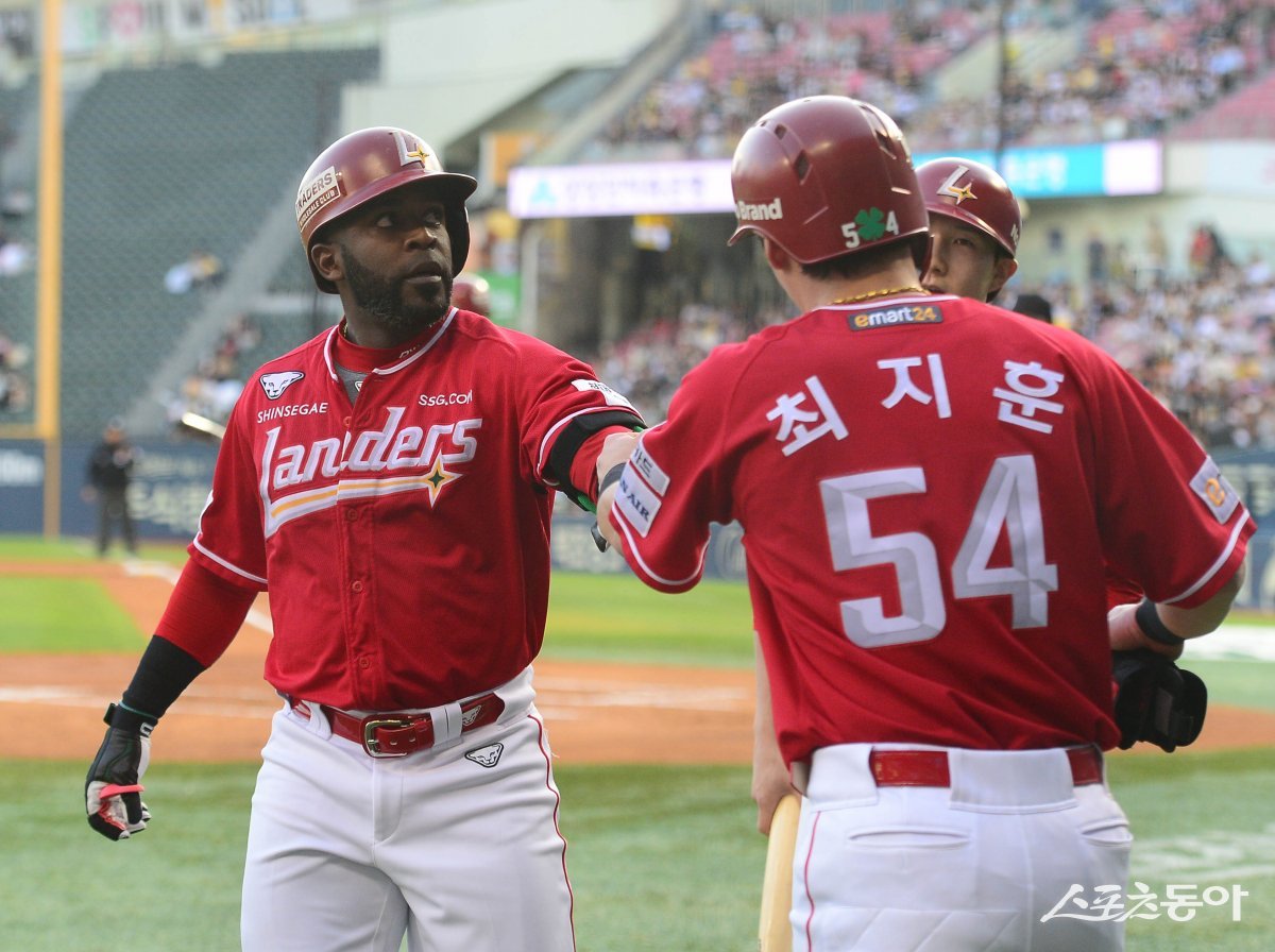 8일 서울 잠실야구장에서 열린 ‘2024 신한 SOL 뱅크 KBO리그’ LG 트윈스와 SSG 랜더스의 경기에서 1회초 1사 1, 2루 SSG 에레디아가 좌월 선제 3점 홈런을 친 후 동료들과 기쁨을 나누고 있다.