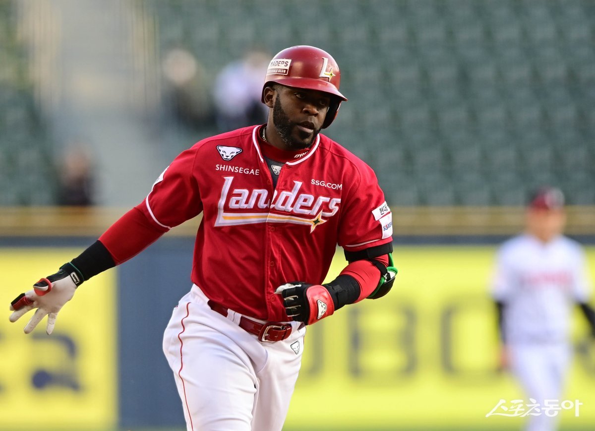 8일 서울 잠실야구장에서 열린 ‘2024 신한 SOL 뱅크 KBO리그’ LG 트윈스와 SSG 랜더스의 경기에서 1회초 1사 1, 2루 SSG 에레디아가 좌월 선제 3점 홈런을 친 후 세리머니를 하고 있다.