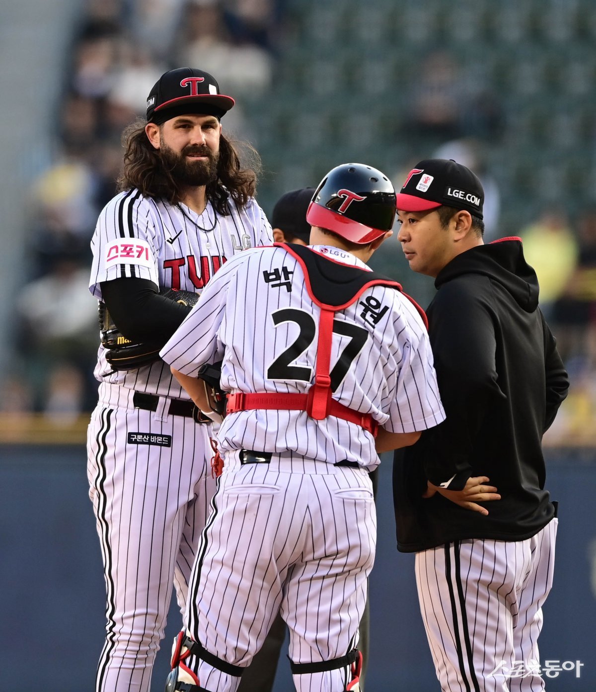 8일 서울 잠실야구장에서 열린 ‘2024 신한 SOL 뱅크 KBO리그’ LG 트윈스와 SSG 랜더스의 경기에서 1회초 SSG에 3점홈런을 허용한 LG 켈리가 포수와 이야기를 하고 있다.