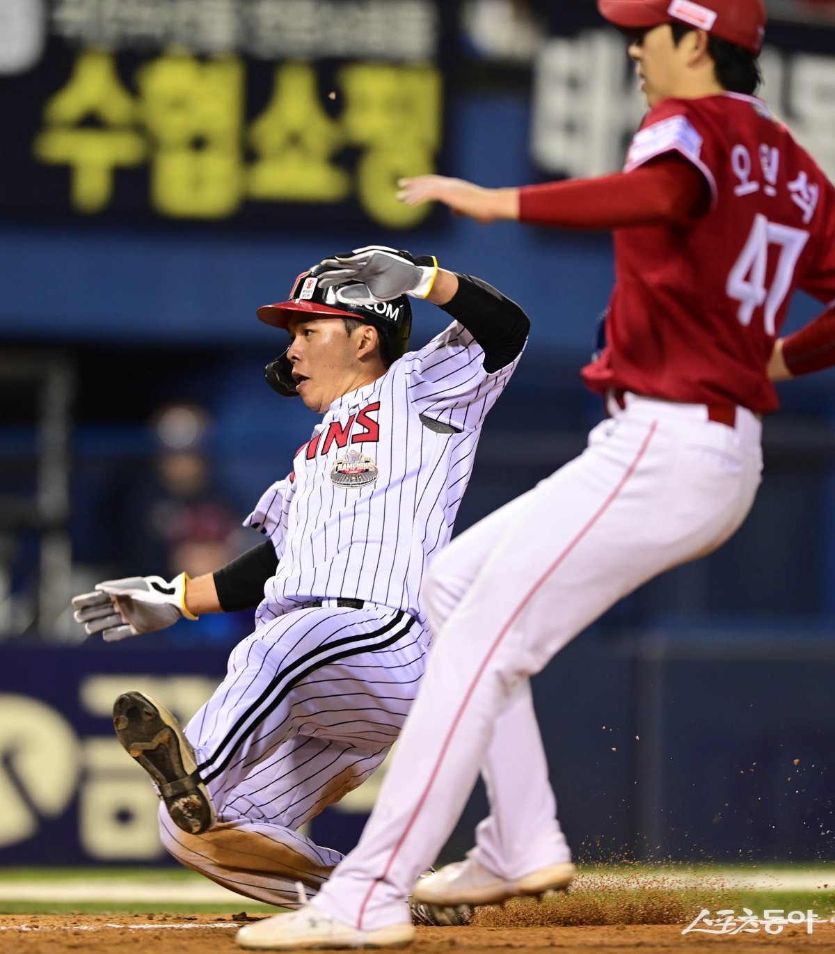 8일 서울 잠실야구장에서 열린 ‘2024 신한 SOL 뱅크 KBO리그’ LG 트윈스와 SSG 랜더스의 경기에서 5회말 1사 3루 LG 김현수의 타석 때 3루주자 문성주가 SSG 오원석의 폭투를 틈타 홈으로 파고들어 세이프 되고 있다.