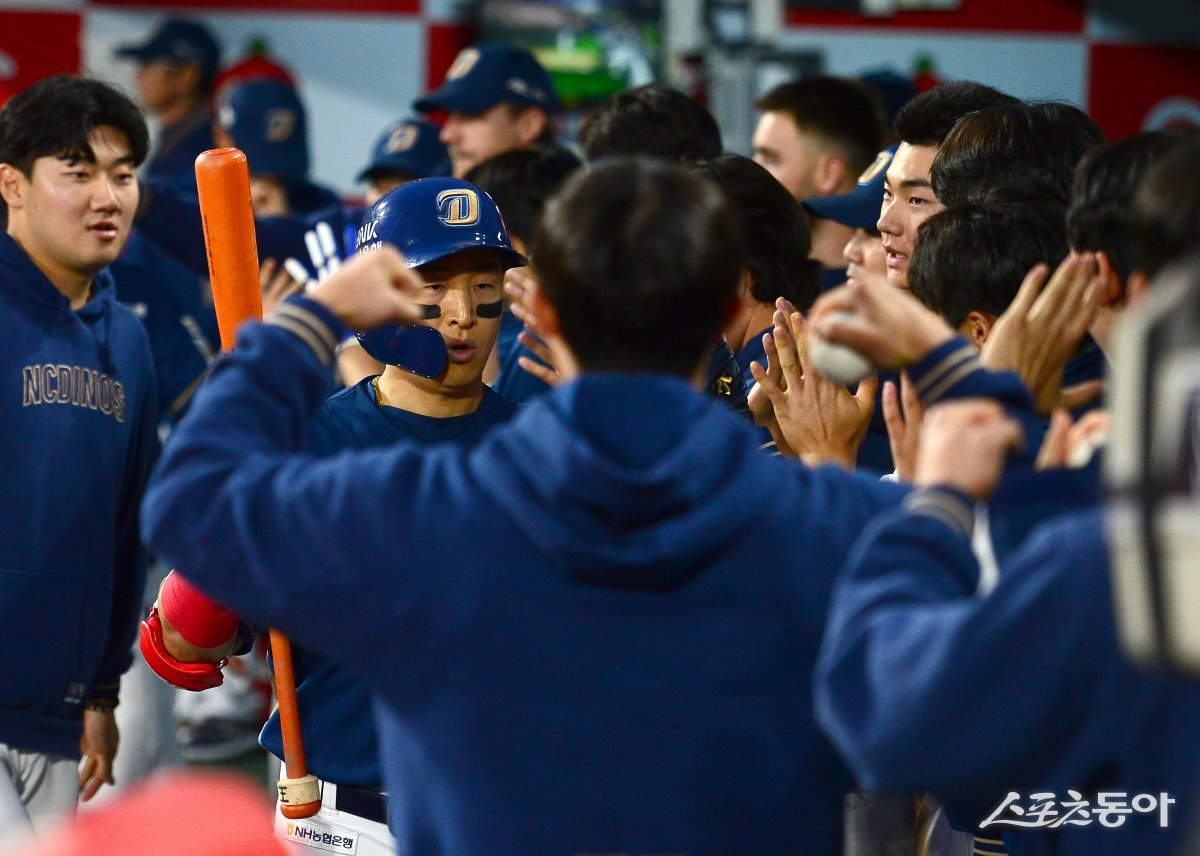 8일 수원 KT위즈파크에서 ‘2024 신한은행 SOL뱅크 KBO리그’ KT 위즈와 NC 다이노스 경기가 열렸다. 4회초 무사 1루 NC 손아섭이 중월 투런 홈런을 날리고 그라운들 돌아 홈인해 하이파이브 하고 있다.
