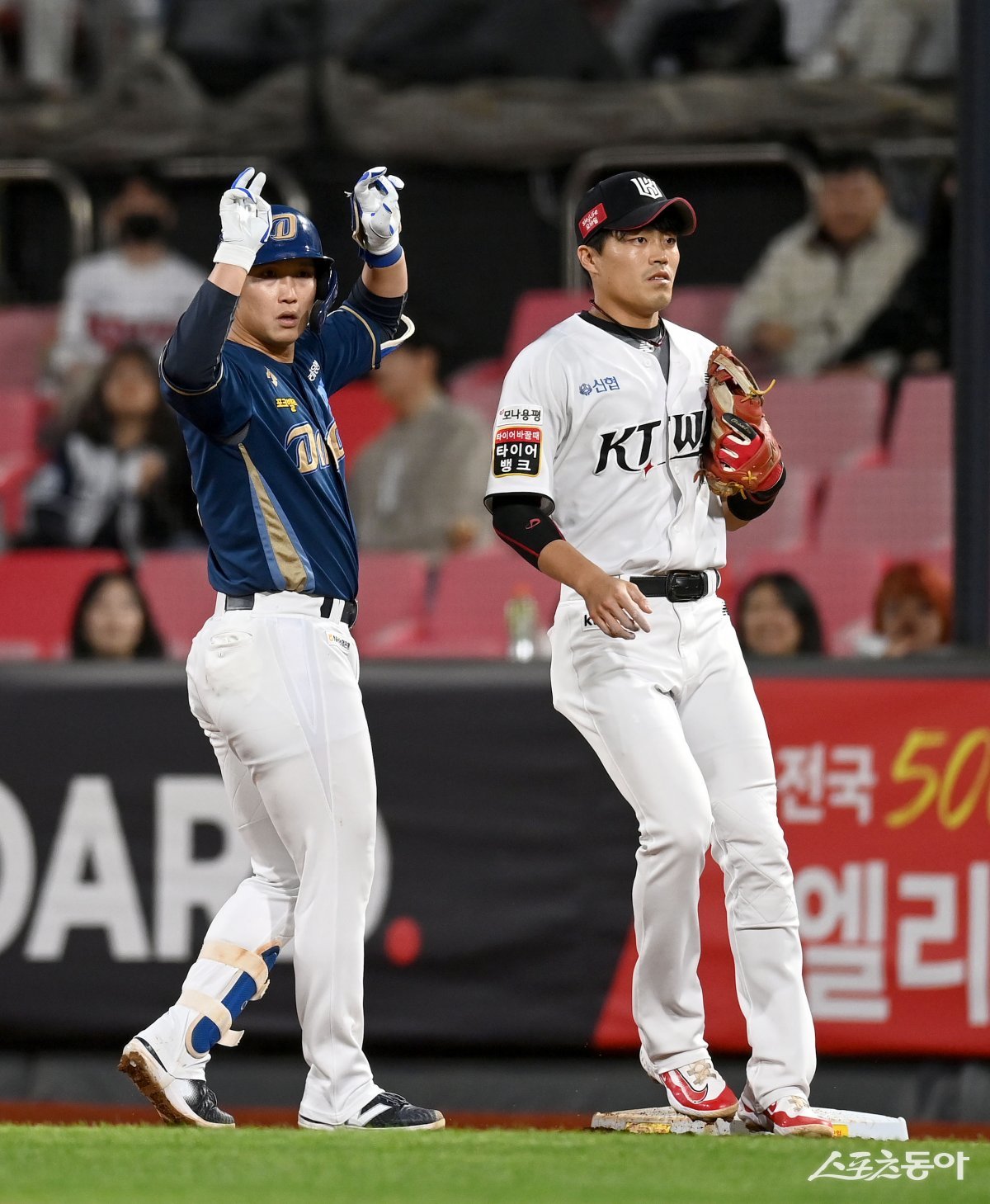8일 수원 KT위즈파크에서 ‘2024 신한은행 SOL뱅크 KBO리그’ KT 위즈와 NC 다이노스 경기가 열렸다. 4회초 2사 2루 NC 서호철이 동점 적시타를 치고 1루에서 기뻐하고 있다.