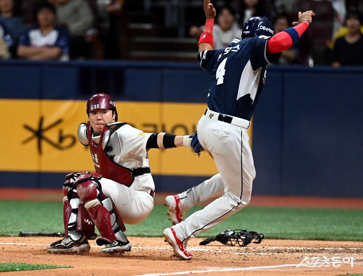 8일 서울 고척스카이돔에서 ‘2024 신한 SOL 뱅크 KBO리그’ 키움 히어로즈와 두산 베어스의 경기가 열렸다. 8회초 1사 2, 3루에서 내야땅볼 때 두산 2루 주자 라모스가 상대 실책으로 키움 김재현의 태그를 피해 득점을 올리고 있다. 두산의 비디오판독 요청으로 태그아웃에서 세이프로 번복됐다.