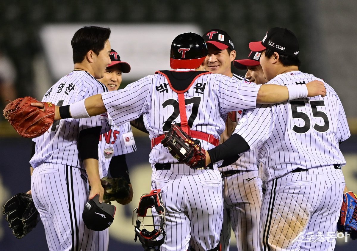 8일 서울 잠실야구장에서 열린 ‘2024 신한 SOL 뱅크 KBO리그’ LG 트윈스와 SSG 랜더스의 경기에서 8-5로 승리한 LG 선수들이 기쁨을 나누고 있다.