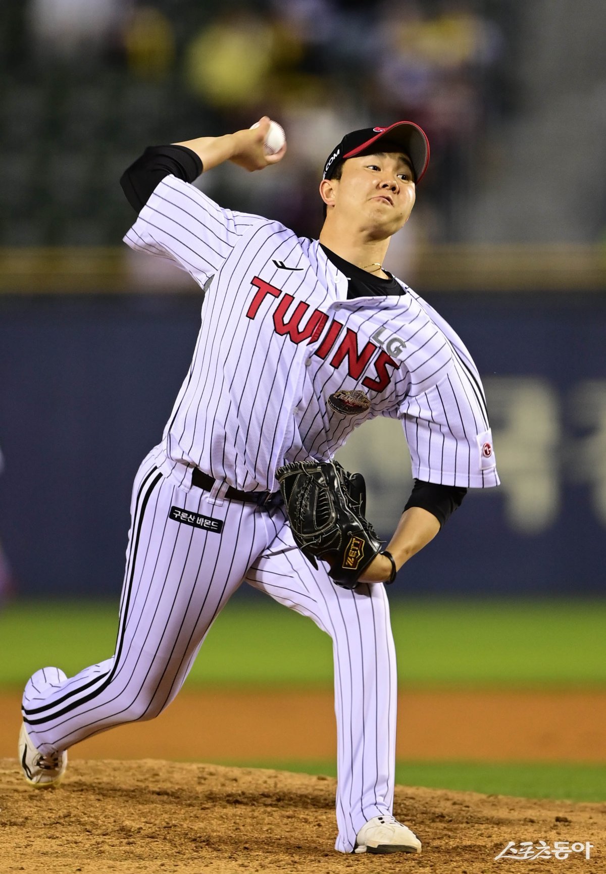 8일 서울 잠실야구장에서 열린 ‘2024 신한 SOL 뱅크 KBO리그’ LG 트윈스와 SSG 랜더스의 경기에서 9회초 LG 유영찬이 교체로 마운드에 올라 역투하고 있다.