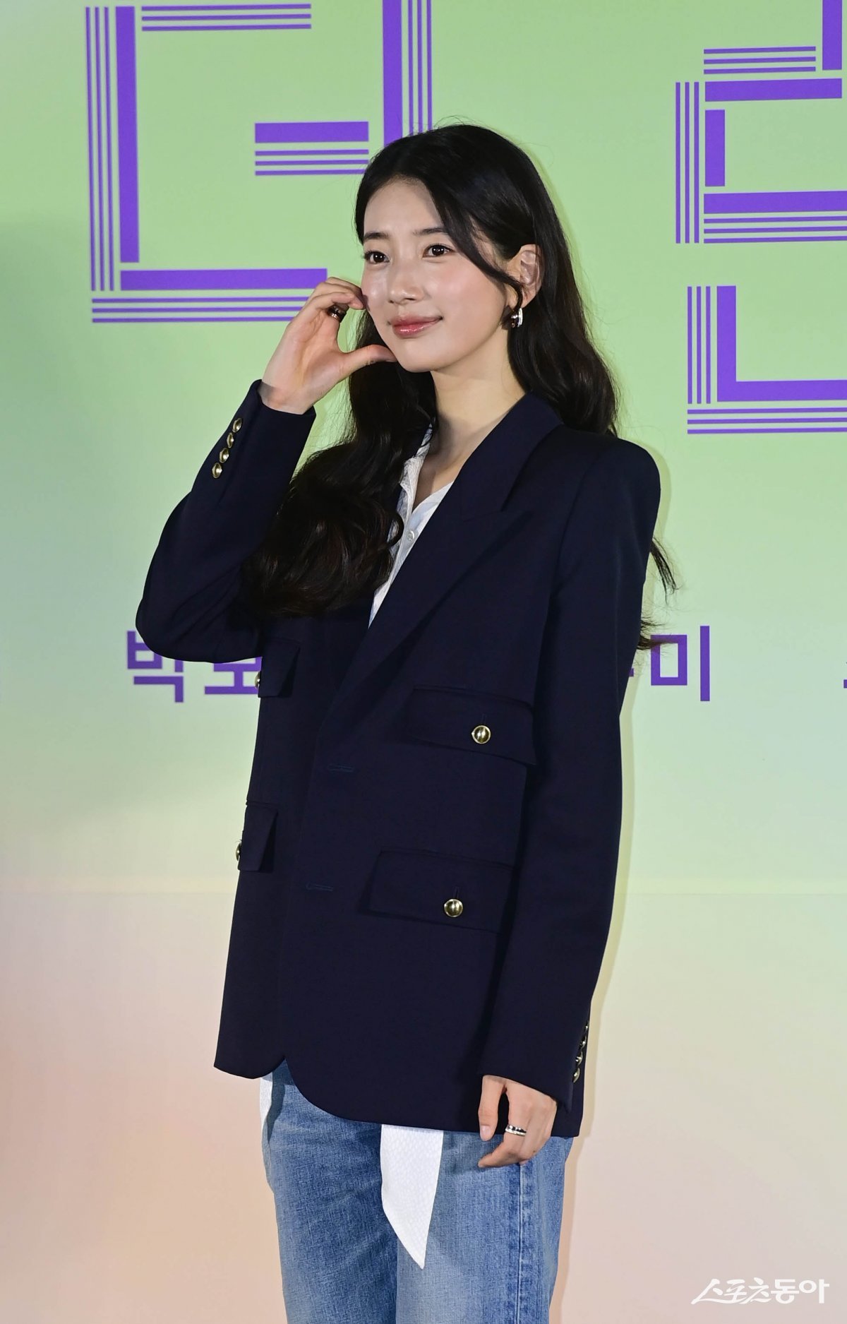 배우 수지가 9일 서울 용산구 CGV용산아이파크몰점에서 열린 영화 ‘원더랜드’ 제작보고회에서 포즈를 취하고 있다.