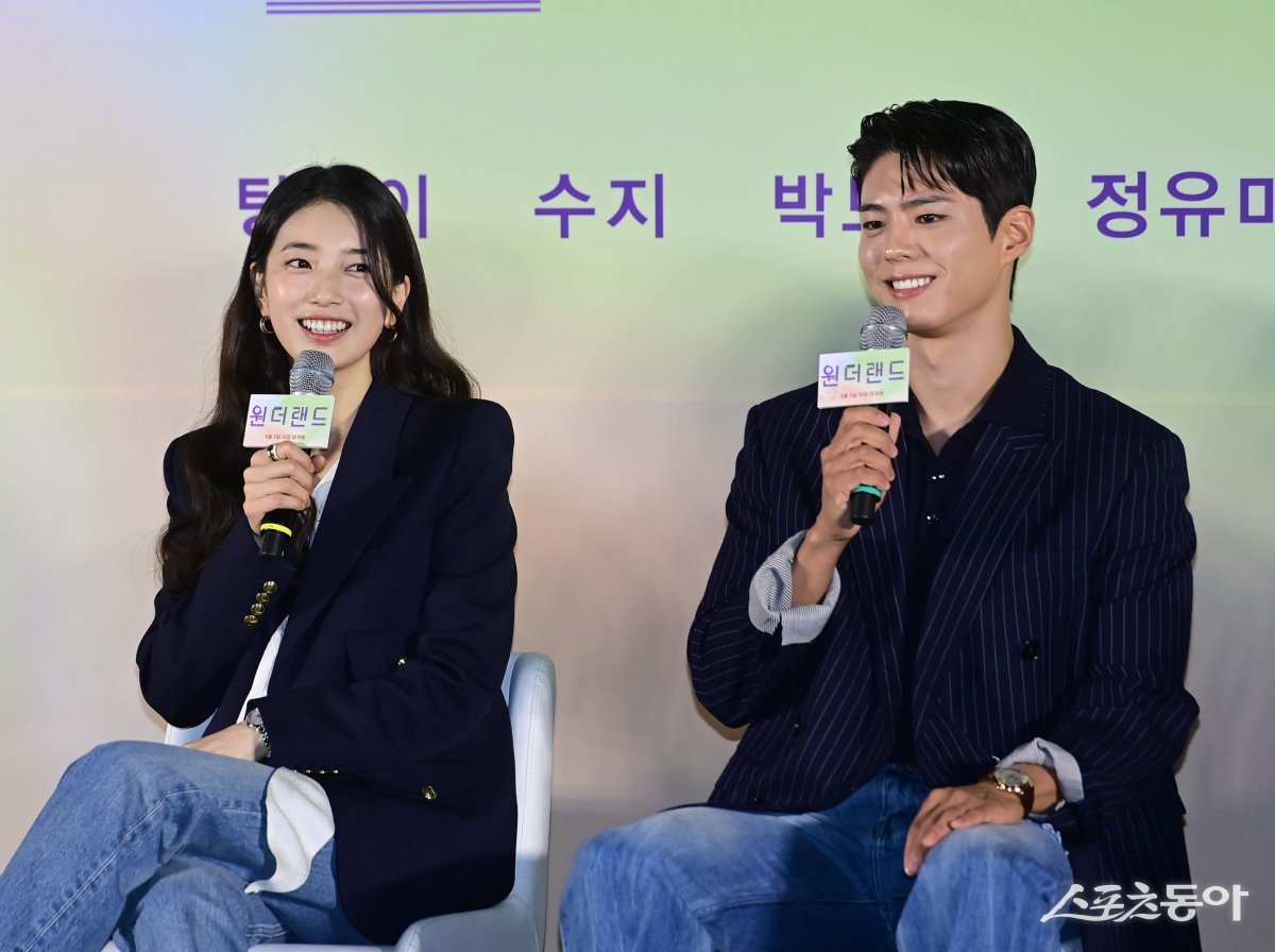 배우 수지, 박보검이 9일 서울 용산구 CGV용산아이파크몰점에서 열린 영화 ‘원더랜드’ 제작보고회에서 MC의 질문에 답하고 있다.