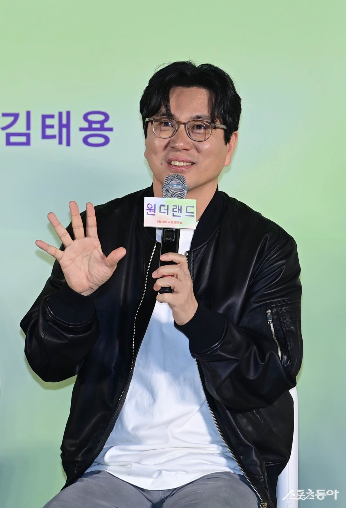 김태용 감독이 9일 서울 용산구 CGV용산아이파크몰점에서 열린 영화 ‘원더랜드’ 제작보고회에서 MC의 질문에 답하고 있다.