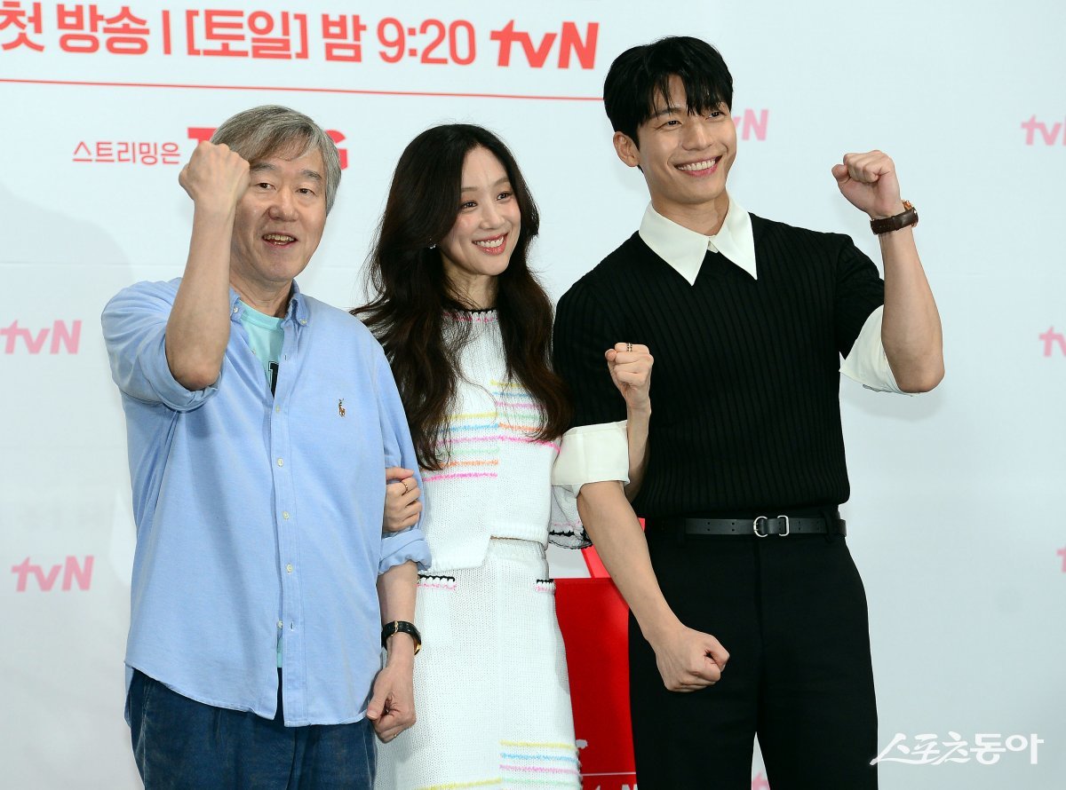 9일 서울 구로구 라마다 신도림호텔에서 열린 tvN 새 토일드라마 ‘졸업’ 제작발표회에 참석한 안판석 PD, 정려원, 위하준이 카메라를 향해 포즈를 취하고 있다.