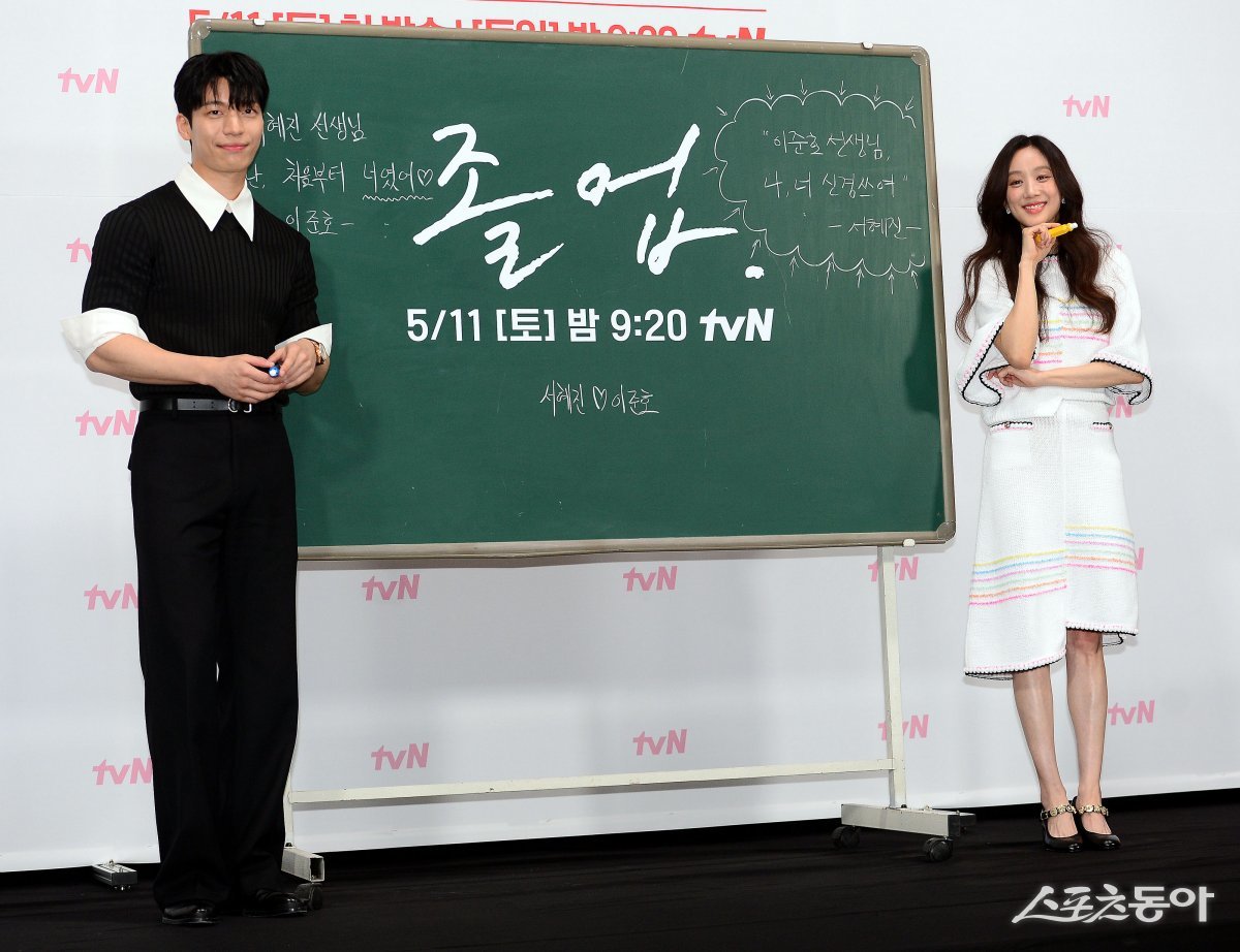 9일 서울 구로구 라마다 신도림호텔에서 열린 tvN 새 토일드라마 ‘졸업’ 제작발표회에 참석한 위하준과 정려원이 카메라를 향해 포즈를 취하고 있다.