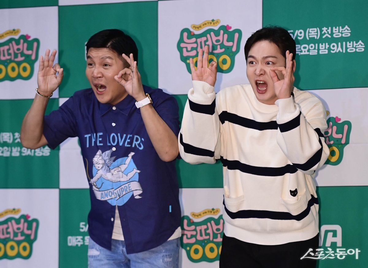 개그맨 조세호, 비투비 이창섭이 9일 서울 마포구 서교동 아만티호텔서울에서 열린 ENA 새 예능프로그램 ‘눈떠보니 OOO’ 제작발표회에서 포즈를 취하고 있다.