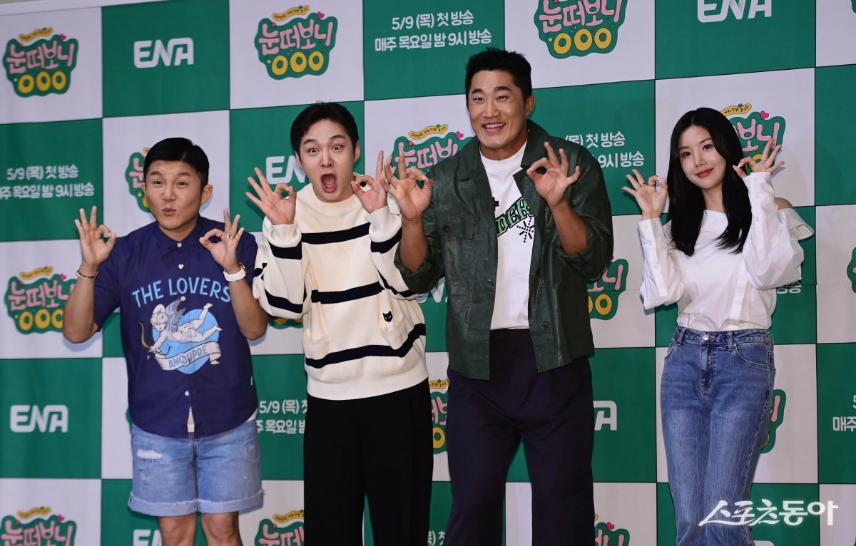 개그맨 조세호, 비투비 이창섭, 방송인 김동현, 가수 권은비가 9일 서울 마포구 서교동 아만티호텔서울에서 열린 ENA 새 예능프로그램 ‘눈떠보니 OOO’ 제작발표회에서 포즈를 취하고 있다.