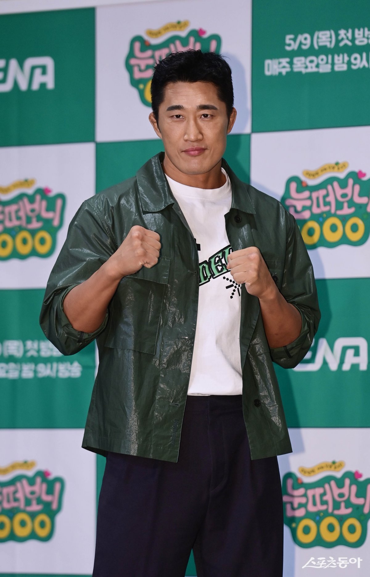 방송인 김동현이 9일 서울 마포구 서교동 아만티호텔서울에서 열린 ENA 새 예능프로그램 ‘눈떠보니 OOO’ 제작발표회에서 포즈를 취하고 있다.