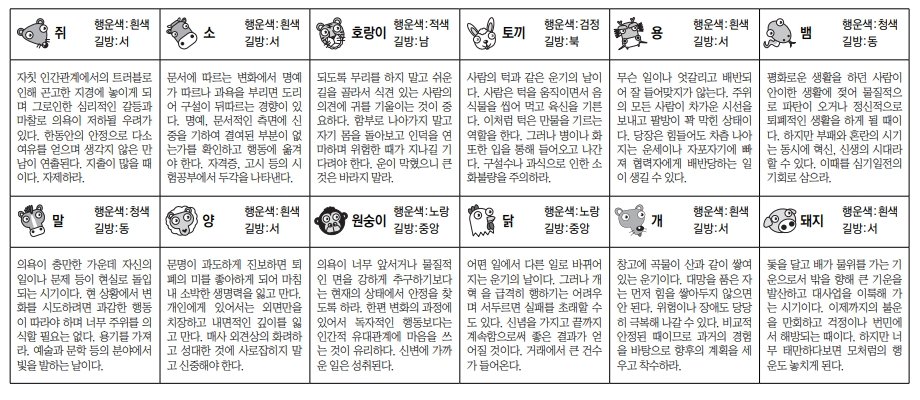 토끼띠: 사람의 턱과 같은 운기의 날이다. 사람은 턱을 움직이면서 음식물을 씹어 먹고 육신을 기른다. 이처럼 턱은 만물을 기르는 역할을 한다. 그러나 병이나 화 또한 입을 통해 들어오고 나간다. 구설수나 과식으로 인한 소화불량을 주의하라.