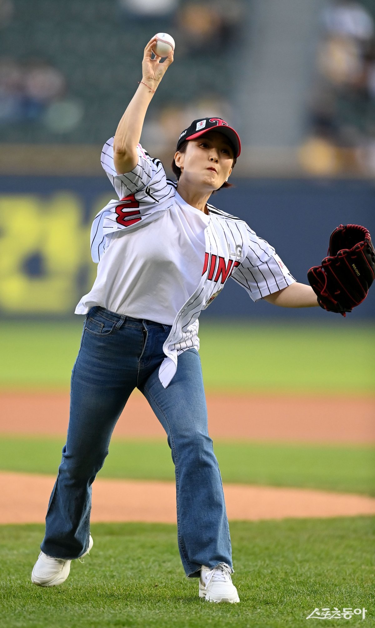 9일 서울 잠실야구장에서 ‘2024 신한은행 SOL뱅크 KBO리그’ SSG 랜더스와 LG 트윈스 경기가 열렸다. 경기 전 박경림 세이브더칠드런 홍보대사가 시구를 하고 있다.