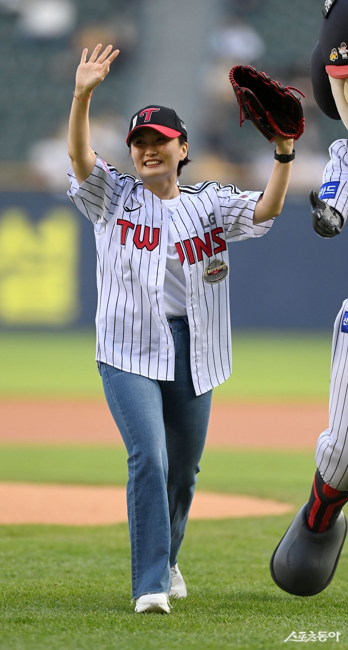 9일 서울 잠실야구장에서 ‘2024 신한은행 SOL뱅크 KBO리그’ SSG 랜더스와 LG 트윈스 경기가 열렸다. 경기 전 박경림 세이브더칠드런 홍보대사가 시구를 마친 후 팬들에게 인사하고 있다.