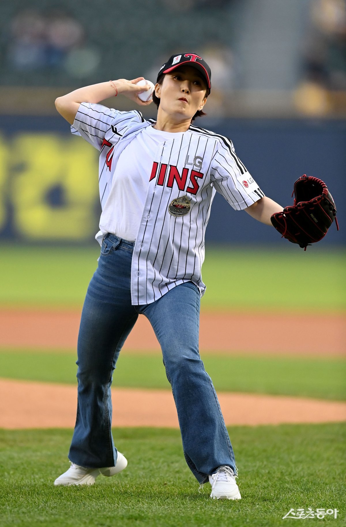 9일 서울 잠실야구장에서 ‘2024 신한은행 SOL뱅크 KBO리그’ SSG 랜더스와 LG 트윈스 경기가 열렸다. 경기 전 박경림 세이브더칠드런 홍보대사가 시구를 하고 있다.