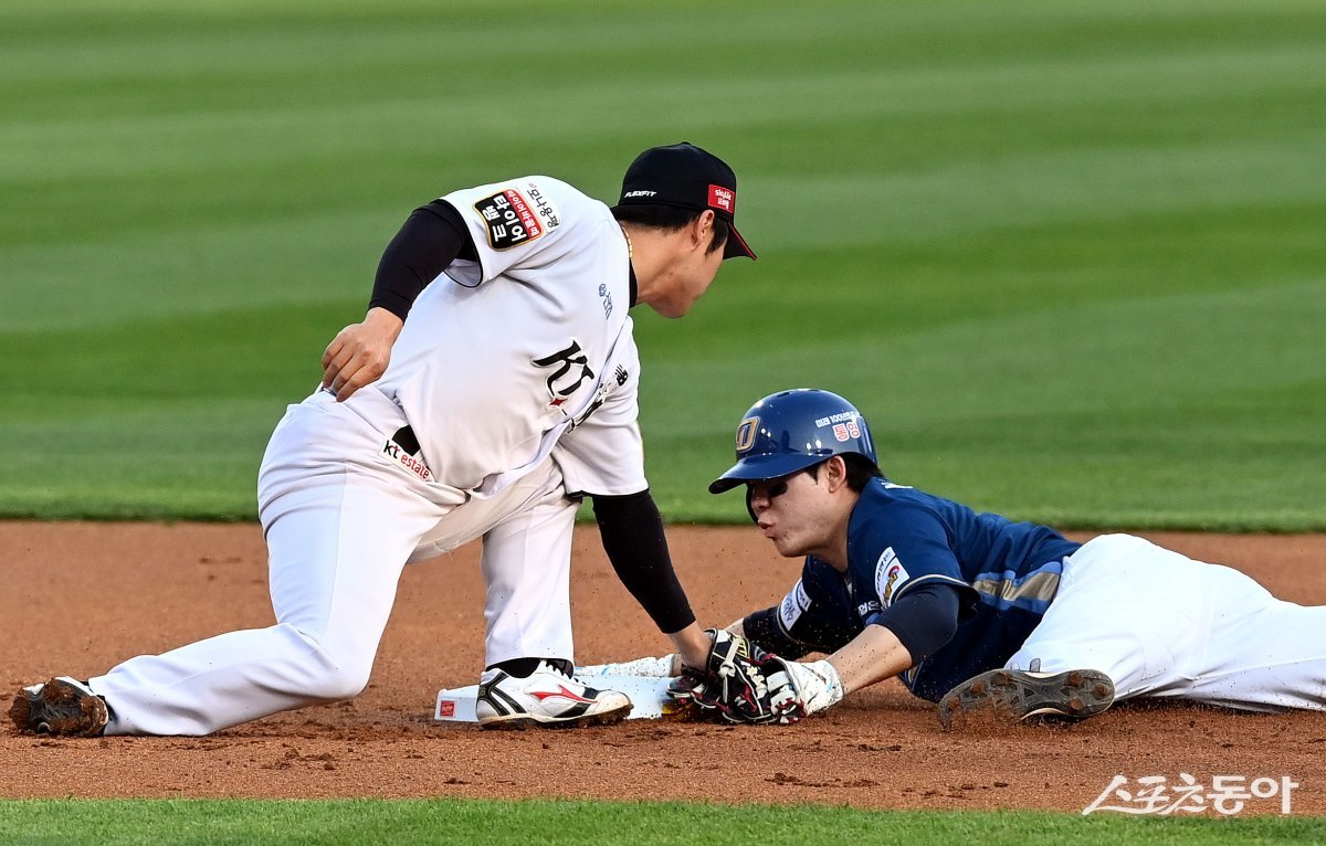 9일 경기도 수원 KT위즈파크에서 ‘2024 신한 SOL 뱅크 KBO리그’ KT 위즈와 NC 다이노스의 경기가 열렸다. 1회초 무사 1루에서 NC 박민우가 2루 도루를 성공시키고 있다.