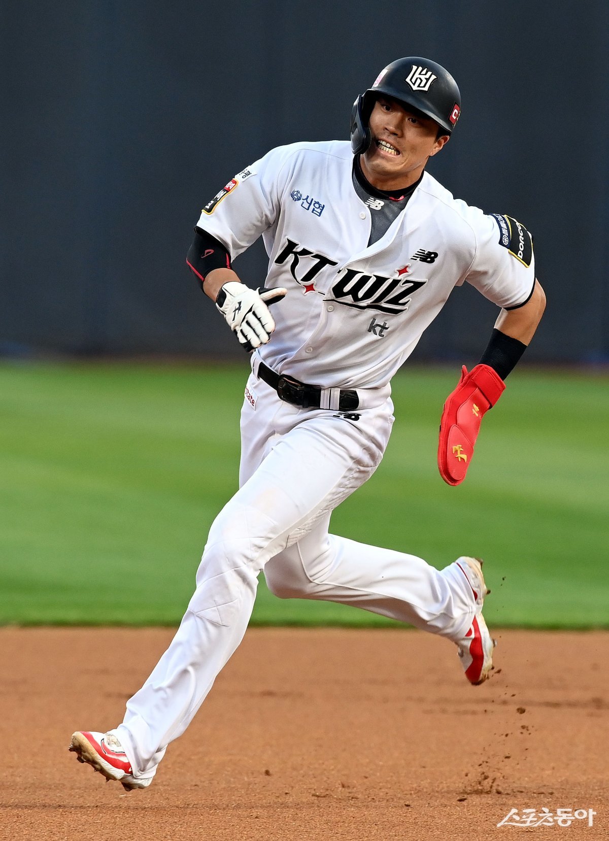 9일 경기도 수원 KT위즈파크에서 ‘2024 신한 SOL 뱅크 KBO리그’ KT 위즈와 NC 다이노스의 경기가 열렸다. 1회말 무사 1루에서 2루타 때 KT 2루 주자 천성호가 그라운드를 질주하고 있다.