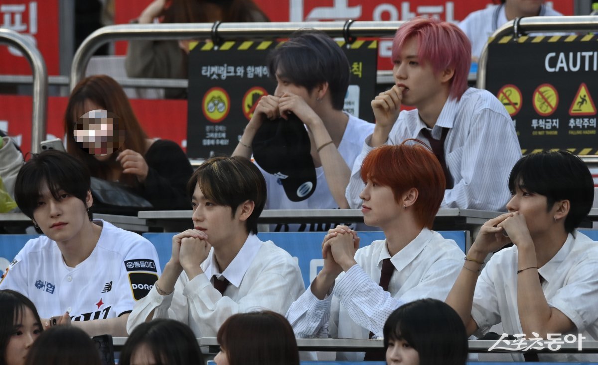 9일 경기도 수원 KT위즈파크에서 ‘2024 신한 SOL 뱅크 KBO리그’ KT 위즈와 NC 다이노스의 경기가 열렸다. 보이그룹 이펙스가 시구를 마친 후 관중석에서 경기를 지켜보고 있다.