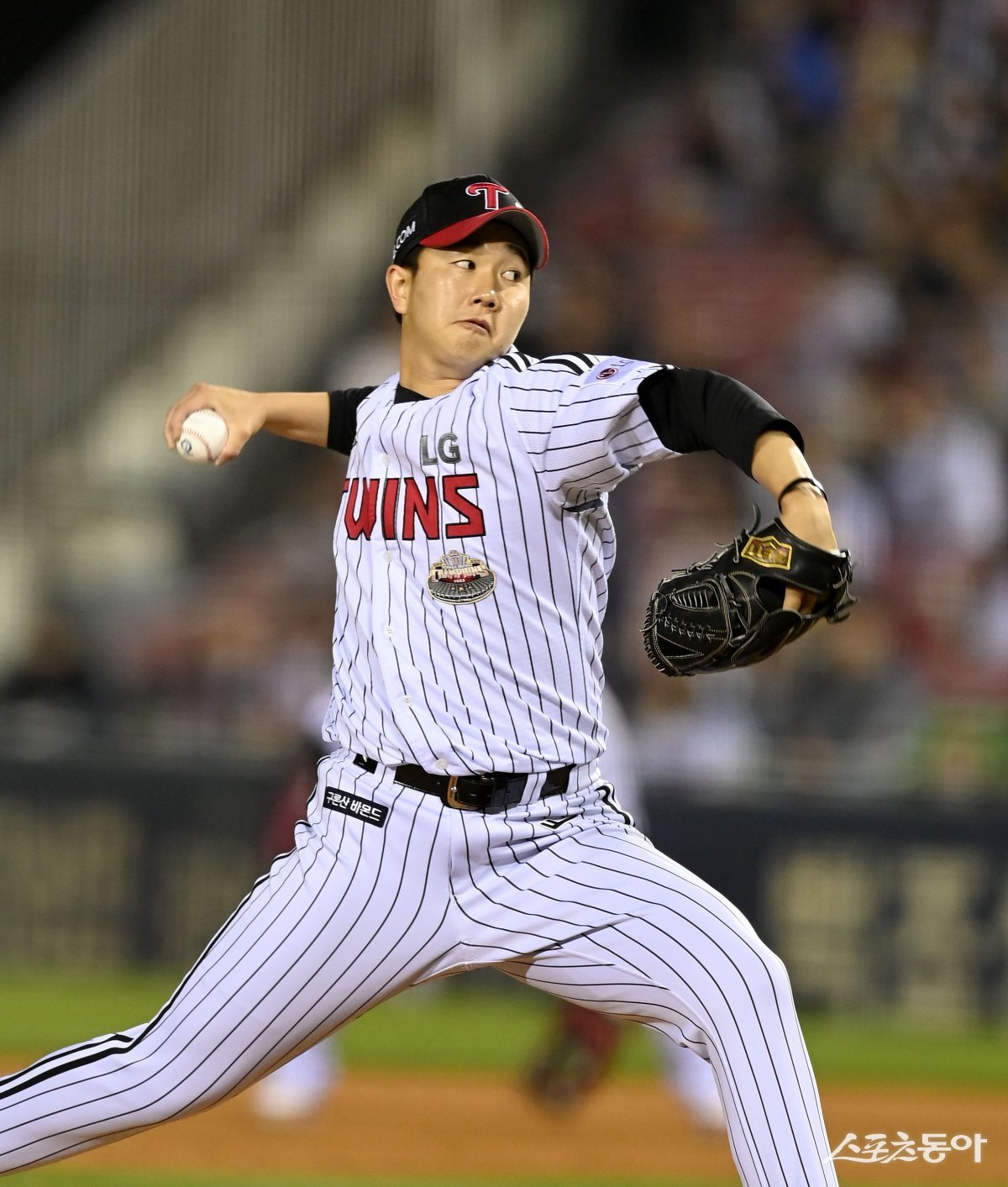 9일 서울 잠실야구장에서 ‘2024 신한은행 SOL뱅크 KBO리그’ SSG 랜더스와 LG 트윈스 경기가 열렸다. 9회초 등판해 1이닝을 무실점으로 막은 LG 유영찬이 역투하고 있다.