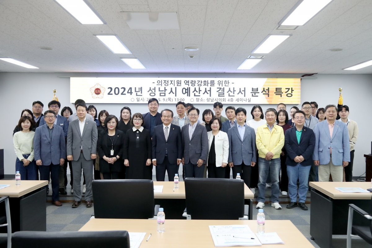 성남시의회(의장 이덕수)는 9일 의회 4층 세미나실에서 성남시의회 의원과 직원을 대상으로 의정 지원 역량 강화를 위한 “2024년 성남시 예산서·결산서 분석 특강”을 실시 했다.